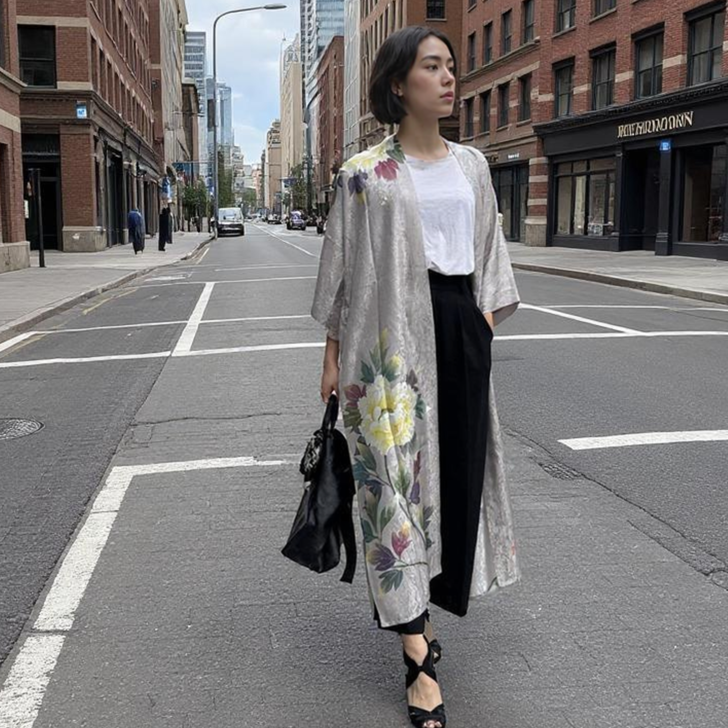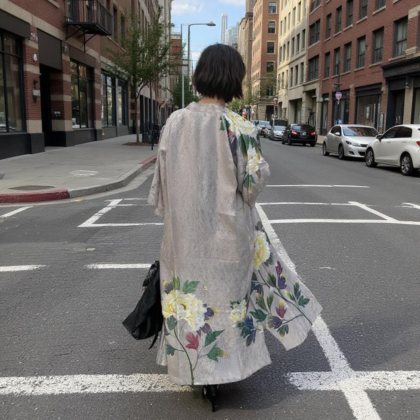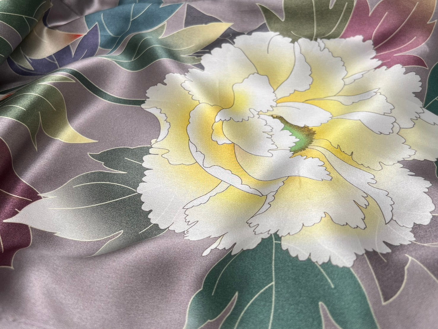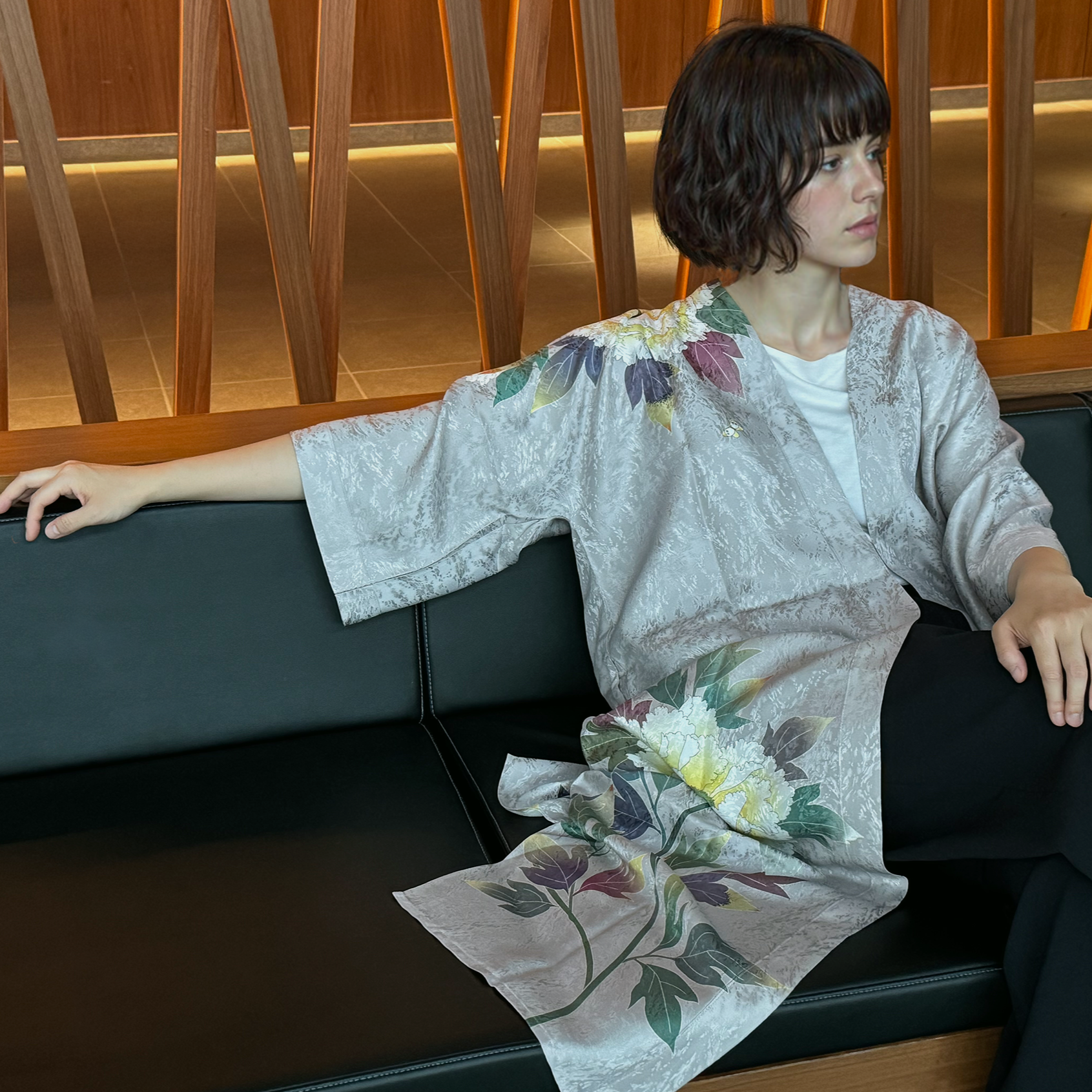 A Kimono Robe adorned with the peony motif of ‘Yuzen’ kimono. A masterpiece filled with the craftsmanship of Japanese artisans, made from the finest 100% silk. Perfect for those moments when you just want to kick back and treat yourself right.