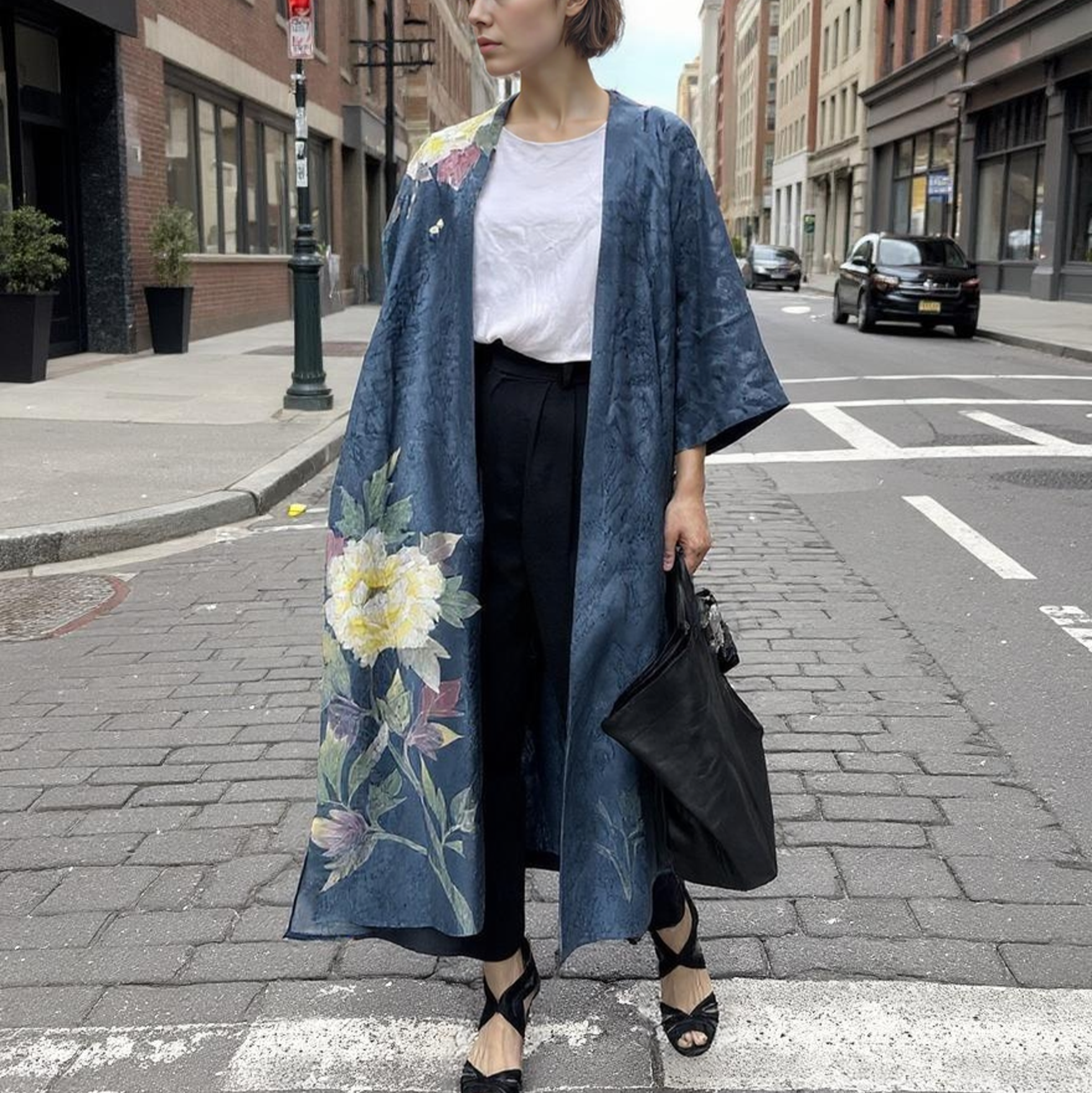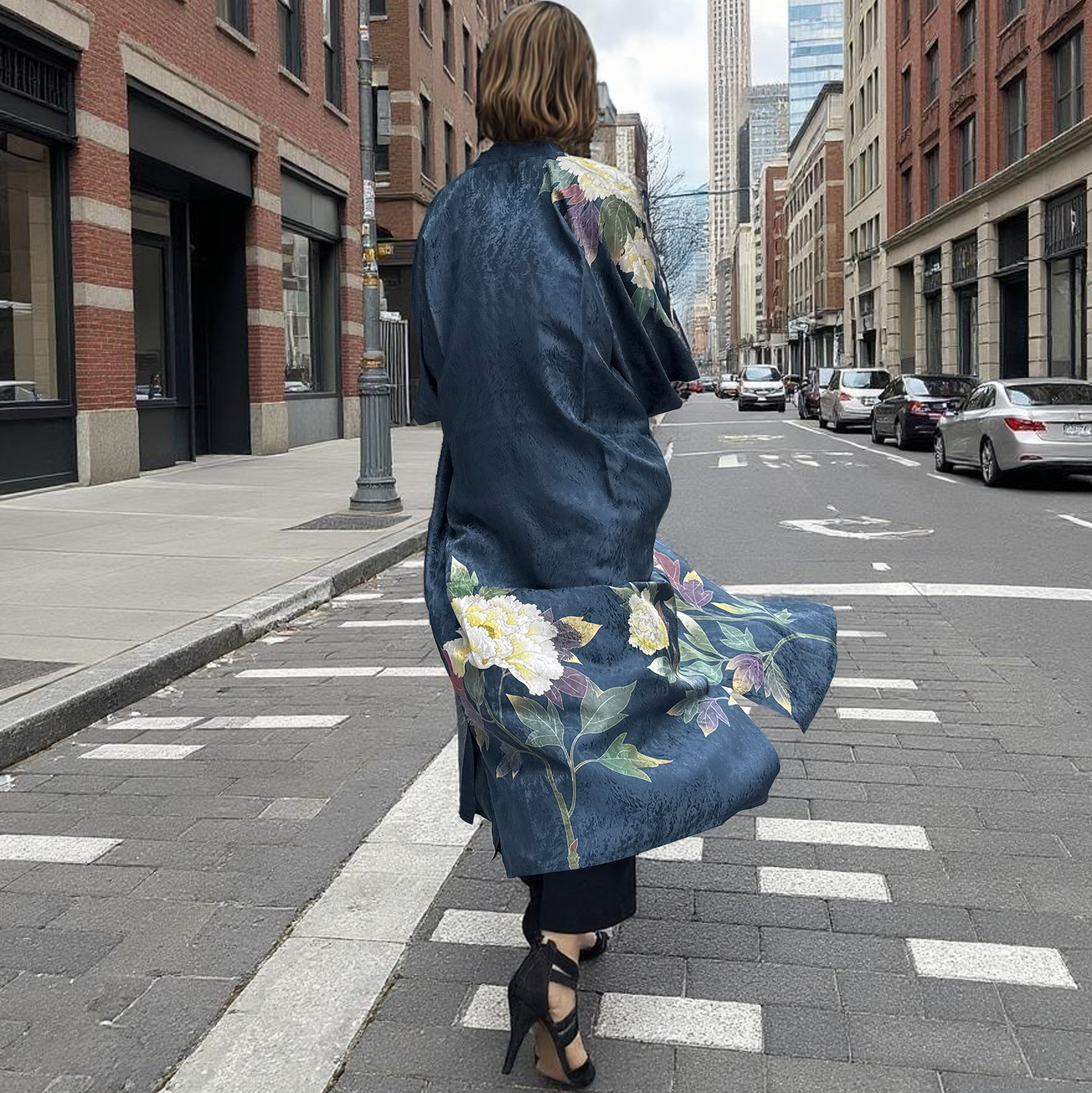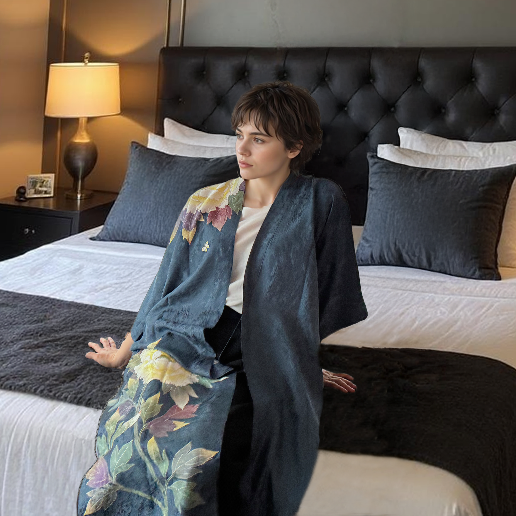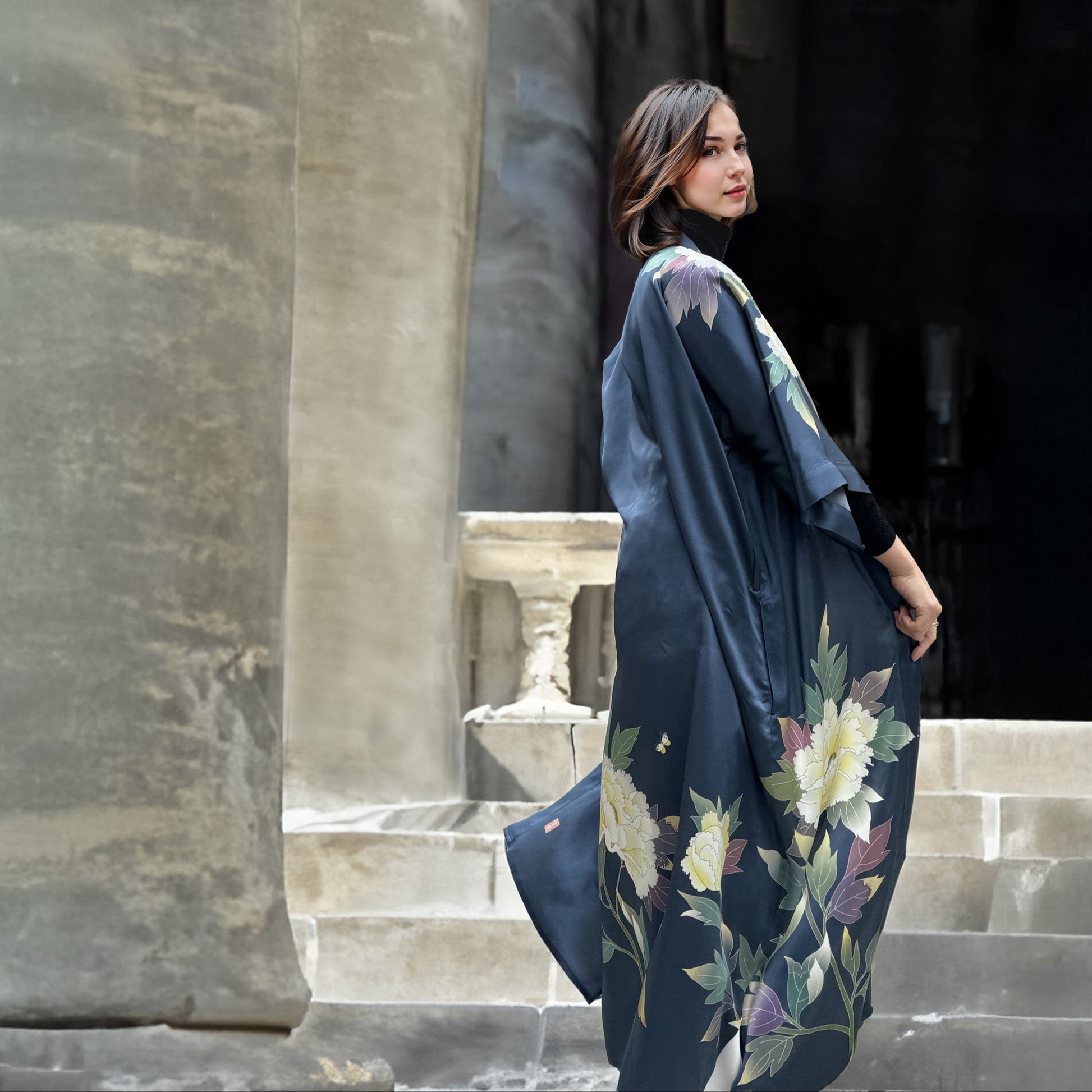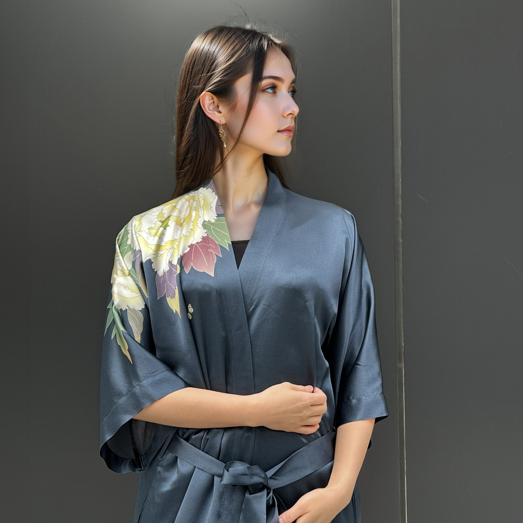 A Kimono Robe adorned with the peony motif of ‘Yuzen’ kimono. A masterpiece filled with the craftsmanship of Japanese artisans, made from the finest 100% silk. Perfect for those moments when you just want to kick back and treat yourself right.